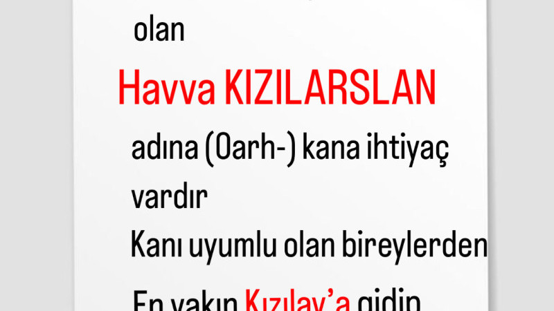 Ereğli Devlet Hastanesi’nde yatmakta olan Havva KIZILARSLAN adına (0 Rh -) kana ihtiyaç vardır.