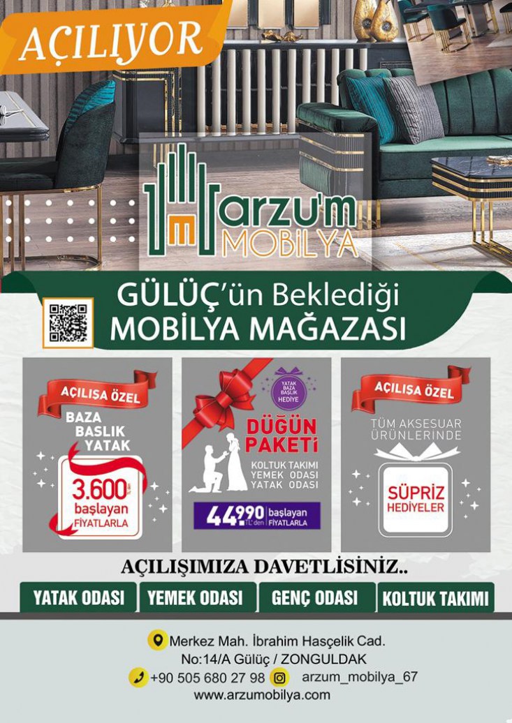 Günün modasına uygun, toplumun her kesimine uygun bütçeleri ve kampanyalarıyla dikkat çeken Arzu’m Mobilya’nın açılışa şok indirim ve sürpriz hediyelerle müşterilerine hizmet vermeyi bekliyor.