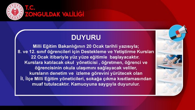 Zonguldak Valiliği yazılı bir açıklama yaparak; 8. ve 12. sınıf öğrencileri için destekleme ve yetiştirme kurslarının 22 Ocak tarihinde başlayacağını belirtti.
