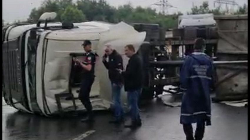 Yan yatan tır'ın sürücüsü yaralanırken; yol trafiğe kapandı.