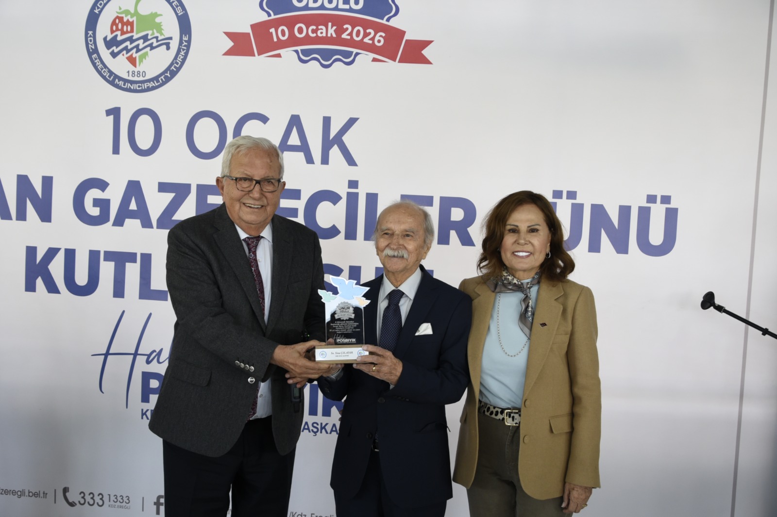 Başkan Posbıyık ve eşi Neriman Posbıyık, 25 yıl ve üzerinde Ereğli’de gazetecilik mesleğine emek veren Sina Çıladır, Necati Günay, Şafak Erel, Kurtuluş Ayyıldız, Hüseyin Orhan, Altan Akçakese, Ali Ceylan, Fikri Kapan, Doğan Gönüllü, Hasan Sarıalp, İsmet Keskin, Sinan Kabatepe, Mustafa Kemal Bektaş, Bilgin Avcı, Özge Cerrah, Serpil Kasapoğlu, Seyhan Dikay, İlknur Turt, Derya Gökbulut Sağlam, Tuncay Tokay, Yasin Ören, Serkan Aydemir, Yusuf Zobar, Muhammet Balaban, Ersen Berk Çelik, Elif Yapıcı, Hülya Çoker, Sibel Pınar, Arzu Tekin, Erdoğan Kutlu, Hakan Kurttekin, Hasan Haşıl, İbrahim Solmaz, Haydar Yağız, Recep Akkaya ve Şafak Negüzel’e ‘Basın Onur Ödülü’ plaketi takdim etti.