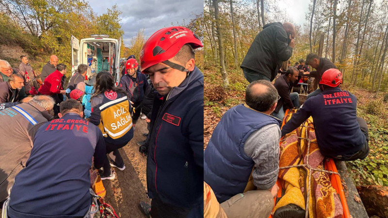 Düştüğü yerde mahsur kalan Hasan Kormaz'ı, Kdz. Ereğli Belediye İtfaiyesi ekibi çıkartarak, traktör römorkunda ambulansa taşındı.