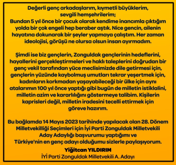 Bu bağlamda 14 Mayıs 2023 tarihinde yapılacak olan 28. Dönem Milletvekilliği Seçimleri için İyi Parti Zonguldak Milletvekili Aday Adaylığı başvurumu yaptığımı ve Türkiye’nin en genç adayı olduğumu sizlerle paylaşıyorum.